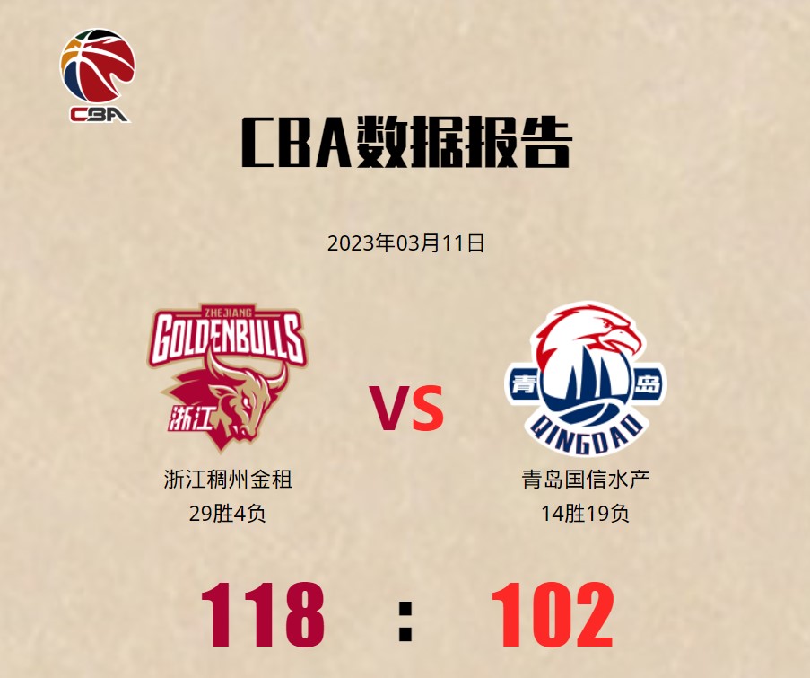 第三節,浙江隊不斷擴大領先優勢,期間更是一度領先20分,青島雖為放棄但始終沒能縮小分差。末節,巨大的分差加上體力消耗導致青島節節敗退,比賽很快進入垃圾時間,浙江也提前鎖定勝局。最終,浙江主場118-102大勝青島,繼續在積分榜上傲視群雄。