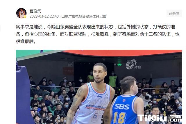 在战胜福建男篮之后,山东的知名媒体记者夏晓司在社交媒体上在22点40分发表了一句话,这也引起球迷和媒体的反思。他发文表示:实事求是的说,今天晚上全队表现出来的状态,包括外援的状态,打硬仗的,包括心理的准备。面对联盟强队很难取胜。到了客场面对前12名的球队也很难取胜。不得不说,这一句话引起球迷和媒体的反思,山东男篮这样的状态,时强时弱,状态起伏不定,可以凭借主场的优势战胜实力偏弱的球队。然而面对首钢男篮、吉林男篮、辽宁男篮这些强队时,特别是面对特别是在客场的时候,面对前12名的球队时球队很难取胜。
