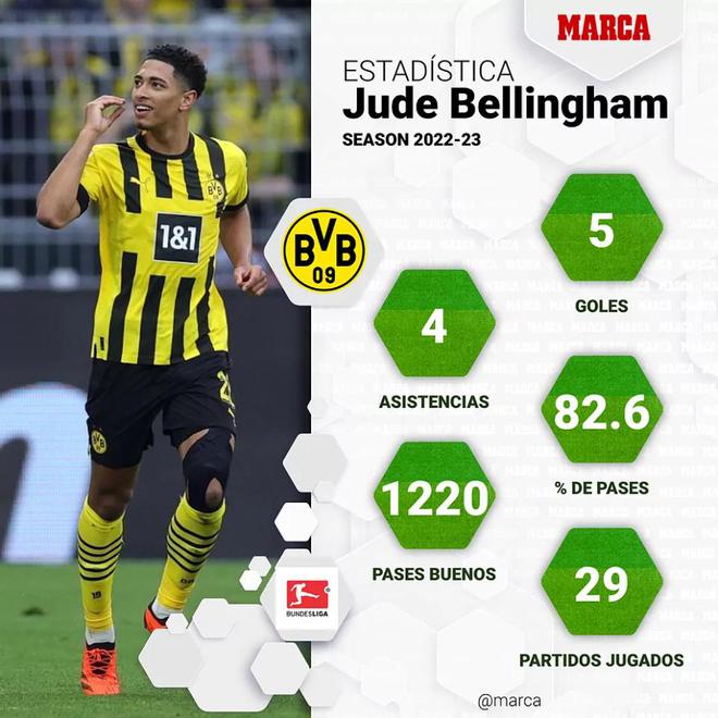 2020年,贝林厄姆以2500万欧元的转会费从伯明翰加盟多特蒙德,短短3年之后,他的身价将高达1亿欧元以上。《马卡报》透露,皇马、多特蒙德将在德甲结束之后宣布这笔转会,贝林厄姆目前的目标是帮助多特蒙德赢得德甲冠军。