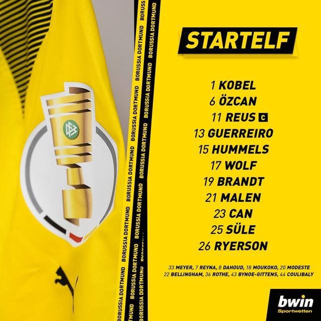 多特首发:1-科贝尔、6-厄兹詹、11-罗伊斯、13-格雷罗、15-胡梅尔斯、17-沃尔夫、19-布兰特、21-马伦、23-埃姆雷-詹、25-聚勒、26-莱尔森、