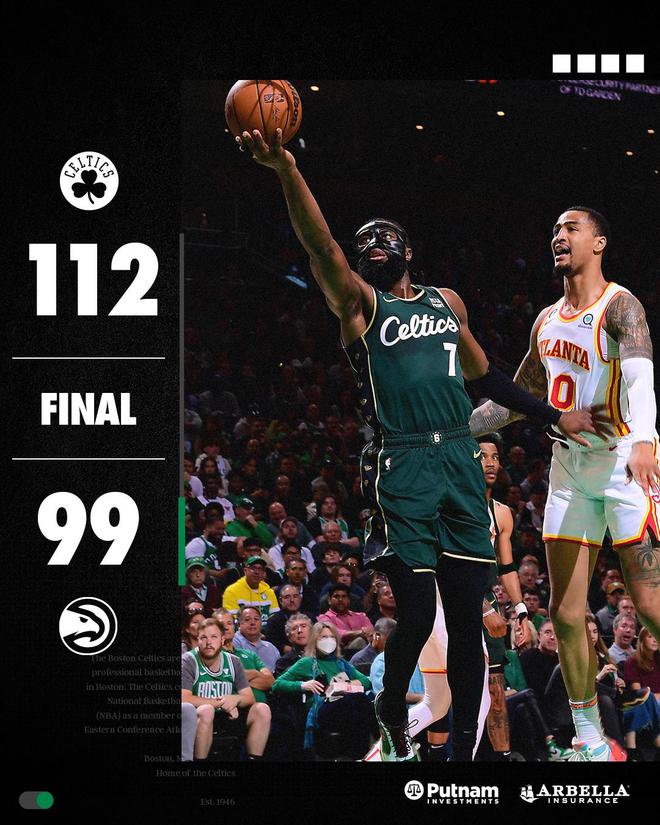 NBA季后赛启幕,波士顿凯尔特人队收获开门红。布朗得到29分和12个篮板,塔图姆得到25分和11个篮板,怀特也有24分,他们带领球队上半场就确立30分的领先优势,凯尔特人队顶住对手反攻,在东部首轮首战主场以112-99战胜亚特兰大老鹰队。凯尔特人队在系列赛里以1-0领先,双方的第二场比赛继续留在波士顿进行。