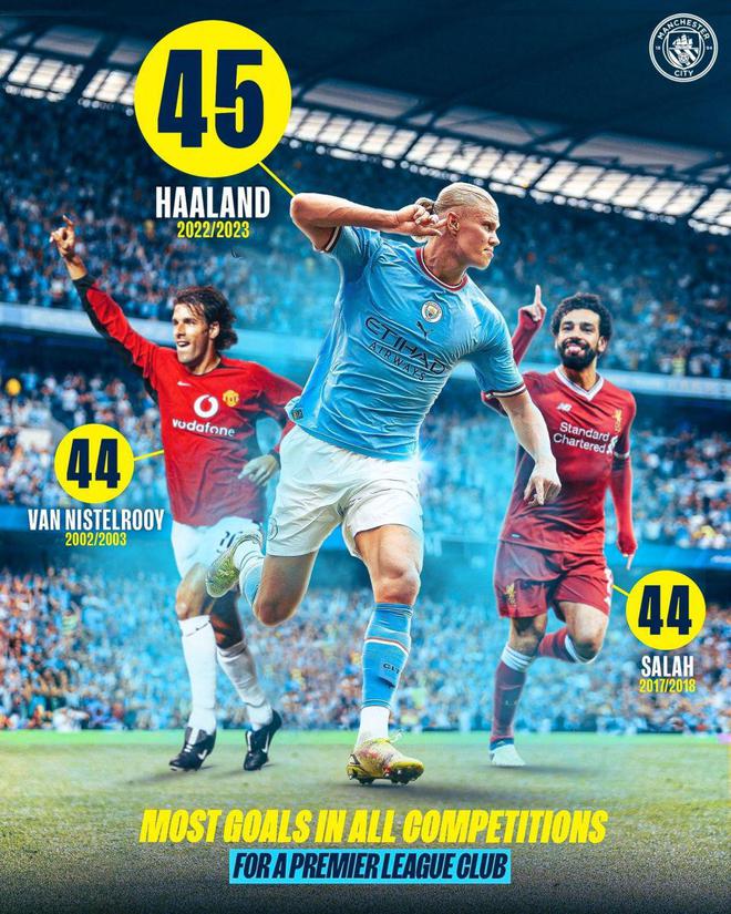 数据显示,这是哈兰德本赛季各项赛事打入的第45球,超越了2017-18赛季的萨拉赫和2002-03赛季的范尼,创造了单赛季英超球员的历史进球纪录!