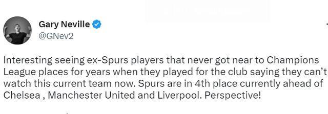 内维尔:“有趣,看到那些多年里摸不到欧冠边(从未接近欧冠席位)的热刺旧将们,说他们没眼看现在的这支热刺。而现在的热刺联赛第四,领先切尔西、曼联、利物浦。这是我的观点!”