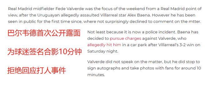 巴埃纳否认自己嘲讽巴尔韦德差点夭折的儿子,黄潜球员报警指控,这对巴尔韦德很不利。警方有监控视频,巴尔韦德也承认自己打人,这必然是要受到处罚的。马卡电台记者Paco Garcia就表示,巴尔韦德打人了,这是事实。肢体暴力确实存在,也会受到处罚。巴尔韦德和巴埃纳的言语冲突,没有目击证人,巴埃纳即便是说了,也不会有处罚,最多是良心和道德上的谴责。