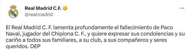 皇马也对此事表示遗憾和哀悼:“皇马俱乐部对Francisco Naval Perez的去世深表遗憾,并向他的家人、球队、队友和亲人表示哀悼和同情。RIP。”