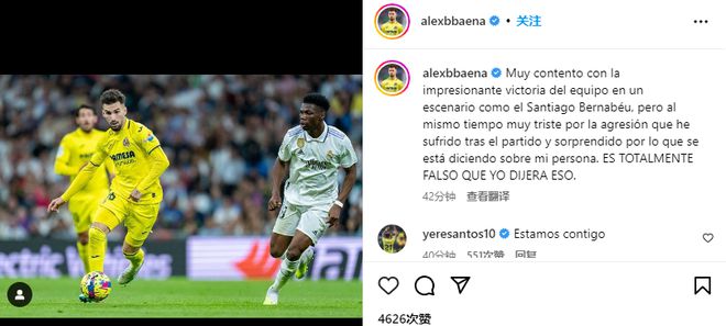 巴埃纳写道:“很高兴球队在伯纳乌拿下了这样一场令人印象深刻的胜利,但同时,我也为赛后自己遭受的侵犯感到难过,也为人们对我的评价感到惊讶。媒体报道的我说过的那些话完全是不实的。”