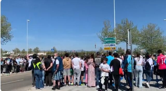 视频显示皇马训练基地外聚集了很多球迷,他们站在道路两旁耐心等待着皇马球员的到来。