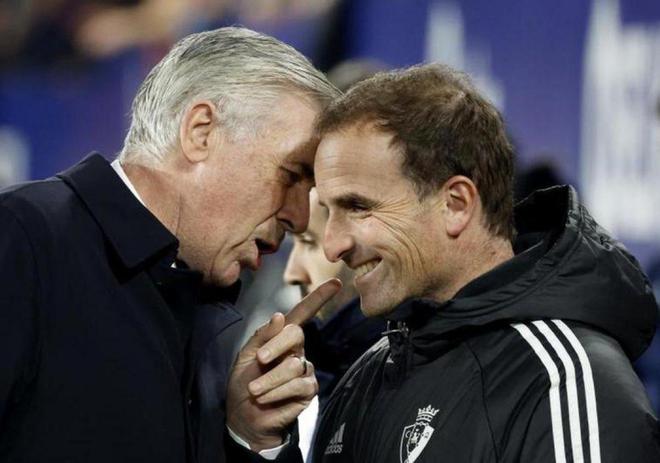 这是发生在2月18日的故事,当时皇马和奥萨苏纳在西甲相遇,皇马客场2-0赢球。安切洛蒂与奥萨苏纳主帅阿拉萨特耳语一番,阿拉萨特听着听着笑出了声,显然有些不敢相信。