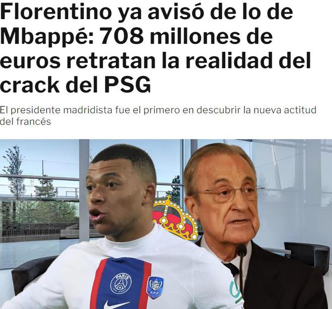 不过,现在的局势发生了180度的大转弯:皇马不再尽力追求姆巴佩,球员却急着想加盟皇马。这与之前的情况是完全相反的,所以现在的局面已经非常明确了。西班牙媒体《DC》直言不讳:姆巴佩为了钱背叛了皇马,我们本可以签下哈兰德。这里还有一个更直截了当的信息:弗洛伦蒂诺不会和巴黎圣日耳曼展开谈判,如果姆巴佩想加盟皇马,那么所有的事宜都应该他自己去处理。