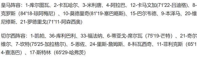 皇马获得禁区前的任意球,阿拉巴主罚直接射门打穿人墙,凯帕将球扑住。第74分钟,皇马开出战术角球,维尼修斯在禁区左侧接球回传中路,弧顶处刚刚替补出场的阿森西奥左脚推射,凯帕扑救不及,皇马2-0领先切尔西。