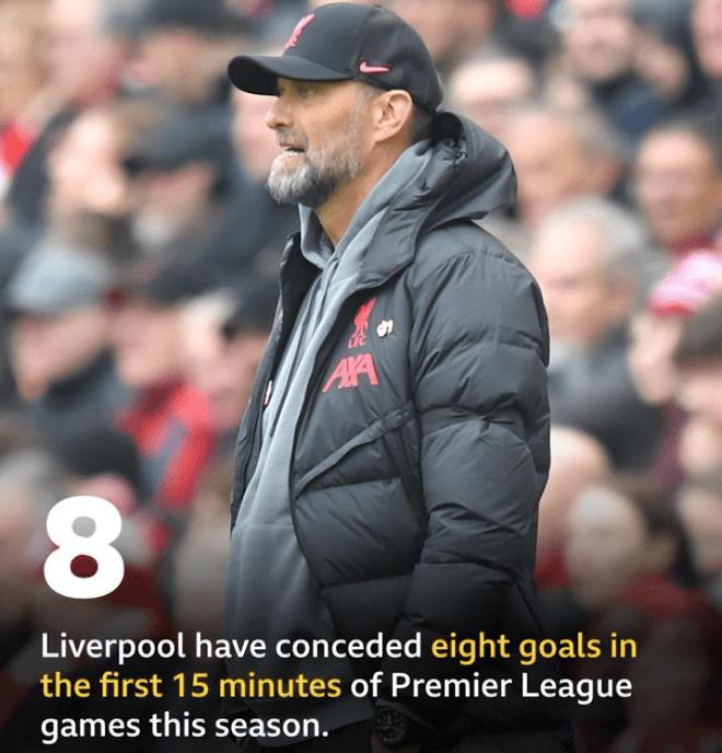 本赛季至今,利物浦在前15分钟的英超比赛里,已经丢了8球。只有伯恩茅斯和阿斯顿维拉在这个数据上,比利物浦更差。