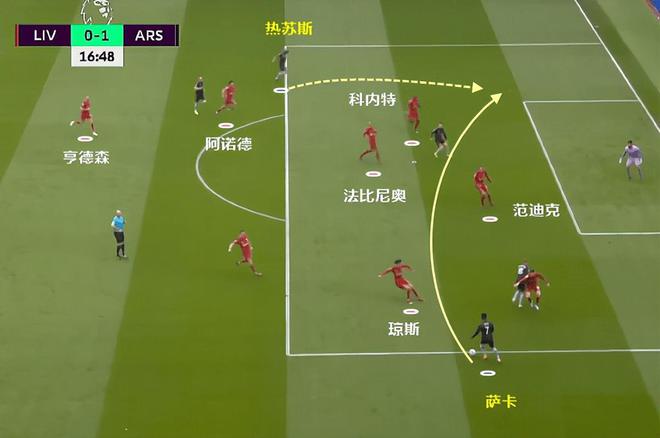 从定格图上可以看得很清楚,亨德森这一波退防移动太慢了,所以阿诺德的第一反应是补了后腰位置,导致热苏斯长驱直入跑后点空位。