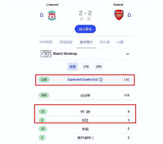 从统计数据可以看到,利物浦的预期进球达到3.96,阿森纳则只有1.41。