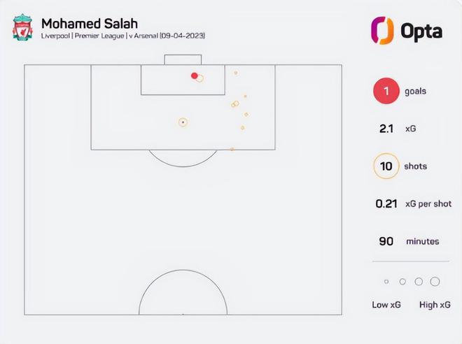 本场比赛,萨拉赫一共射门10次,单人预期进球居然达到了2.1!这个数字,超过了阿森纳全队的9次射门和1.41的预期进球。