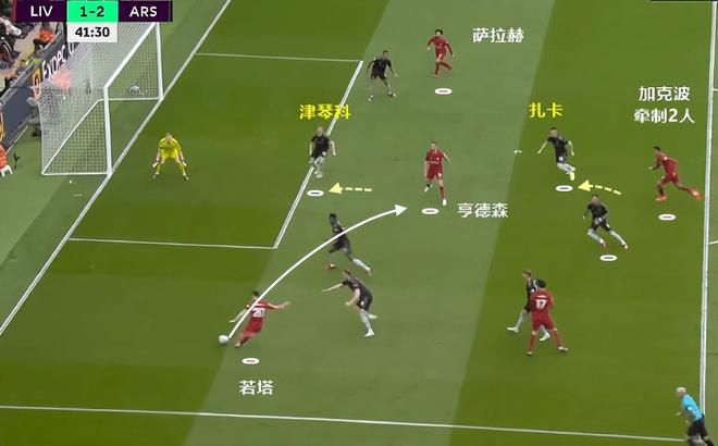 扎卡被加克波带走回不来,随后津琴科害怕若塔直接传萨拉赫,所以卡内线的传球方向,导致亨德森被完全放空。