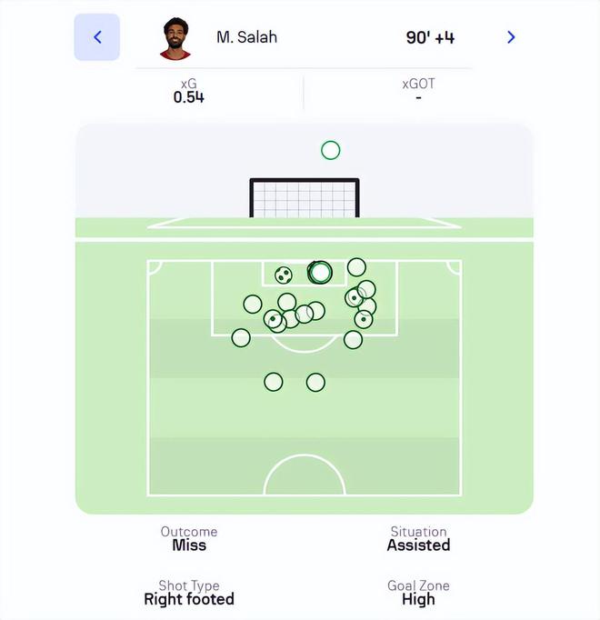 其中萨拉赫和科内特的射门,预计进球都超过0.54(超过0.3就是重大得分机会了)。