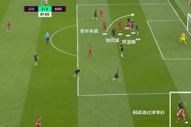 跟着包抄的不是别人,就是传球后高速前插的热苏斯。利物浦中场退防不到位,是热苏斯可以获得机会的主要原因。