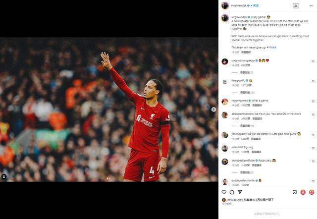 范迪克写道:“疯狂的比赛!这肯定是一个过山车般的赛季。球队个人和整体的状态都不如从前,所以我们必须团结在一起。通过努力工作,我们都相信我们可以重新创造更多精彩的时刻。这支球队永远不会放弃。”