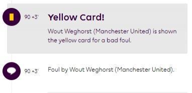 英超官网的描述是,韦霍斯特因恶意犯规被出示黄牌↓