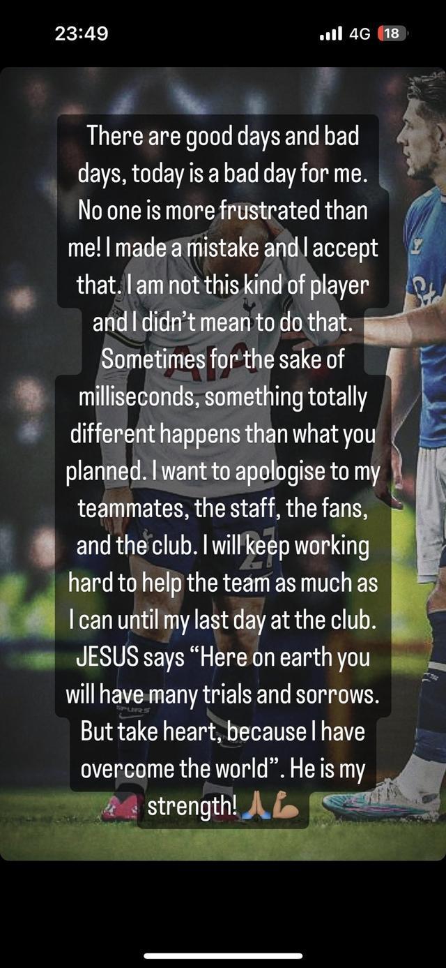 “我想向我的队友、工作人员、球迷和俱乐部道歉,我会继续努力工作,尽可能帮助球队,直到我在这里的最后一天。耶稣说:‘在地球上你会遇到很多磨难和悲伤,但请振作起来,因为我已经征服了这个世界’,他是我力量的来源。”