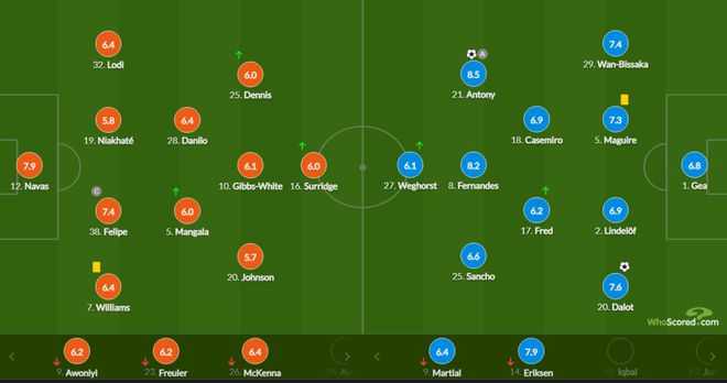 诺丁汉森林(3412):12-纳瓦斯;38-费利佩,19-尼亚基特,26-麦肯纳(81’25-丹尼斯);7-尼科-威廉姆斯,23-弗罗伊勒(65’5-曼加拉),28-达尼洛,32-洛迪;10-吉布斯-怀特;20-约翰逊,9-阿沃尼伊(65’16-苏里奇)