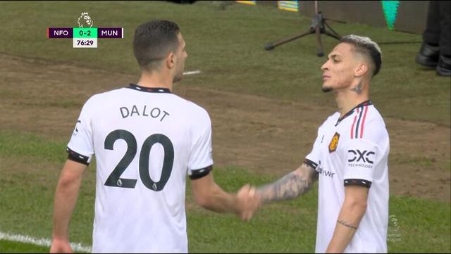 直播吧4月17日讯 英超第31轮,曼联vs诺丁汉森林。第76分钟,安东尼连续盘带送直塞,达洛特前插破门,曼联2-0领先!安东尼本场传射建功。