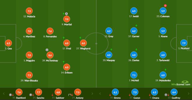 曼联(4231):1-德赫亚;29-万比萨卡,5-马奎尔,6-利桑德罗-马丁内斯,12-马拉西亚;39-麦克托米奈,8-B费;21-安东尼(60’9-马夏尔),15-萨比策(76’17-弗雷德),25-桑乔(77’14-埃里克森);10-拉什福德(80’27-韦霍斯特)