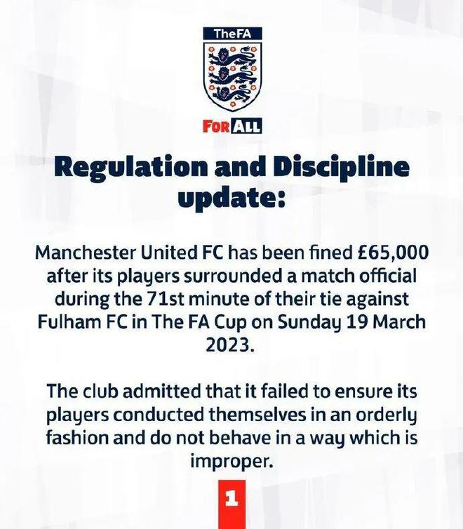 官方:由于在与富勒姆的足总杯比赛第71分钟,曼联球员围着裁判的行为,红魔被英足总罚款65000镑。