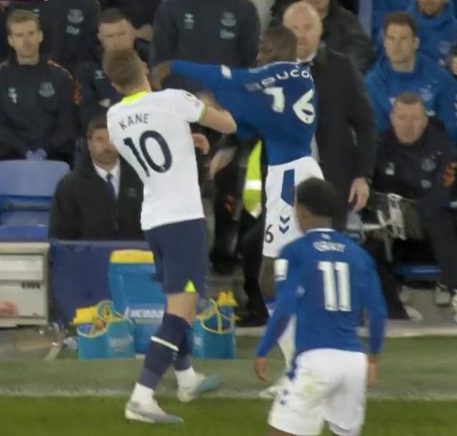 (杜库雷退役)对着脸就是一下杜库雷击打凯恩面部,裁判出示直红