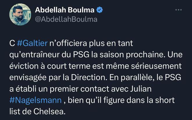据法国记者Abdellah Boulma的消息,加尔蒂下赛季将不再担任巴黎主帅,管理层甚至考虑现在就解雇他。与此同时,虽然纳格尔斯曼是切尔西主帅的候选之一,但巴黎圣日耳曼已经率先与他取得了联系。