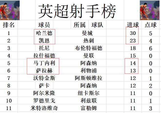 射手榜方面,哈兰德30球高居榜首,凯恩23球紧随其后,托尼18球位列第3。马丁内利今天传射建功,14球排在拉什福德之后。萨拉赫错失点球无缘双响,他就还是1球之差排在马丁内利之后位列第6。打入绝平一球的菲尔米诺,还差2球才能挤入前十。