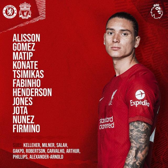 利物浦首发:1-阿利森、2-戈麦斯、32-马蒂普、5-科纳特、21-齐米卡斯、3-法比尼奥、14-亨德森、17-琼斯、20-若塔、27-努涅斯、9-菲尔米诺