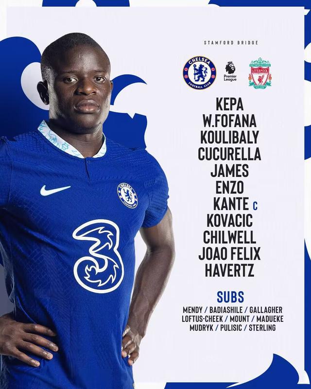 切尔西首发:1-凯帕、21-奇尔维尔、33-W-福法纳、32-库库雷利亚、26-库利巴利、24-詹姆斯、5-恩佐、7-坎特、8-科瓦西奇、11-菲利克斯、29-哈弗茨