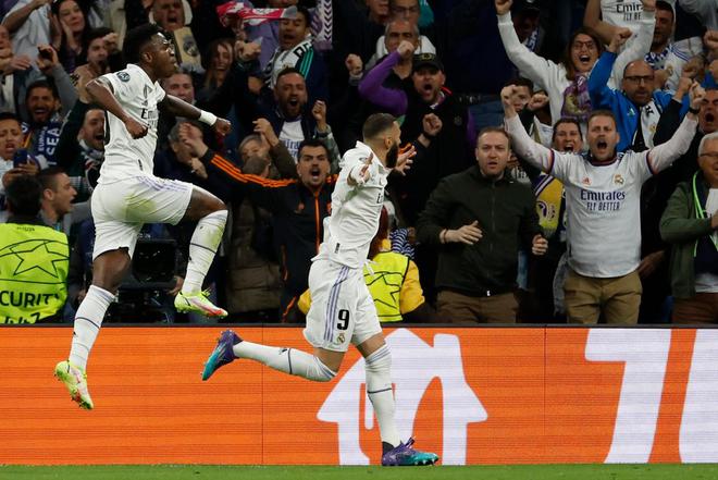 第21分钟,皇马率先打破僵局:克罗斯精准长传转移,卡瓦哈尔的挑传恰到好处,韦尼修斯抢在福法纳身前凌空垫射被扑出,本泽马补射得手。这是本泽马欧冠生涯第90球,距离莱万多夫斯基只差1球。