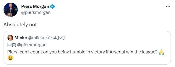 一位球迷在推特上问摩根:“皮尔斯,如果阿森纳赢得英超冠军,你能低调谦逊一点吗?”