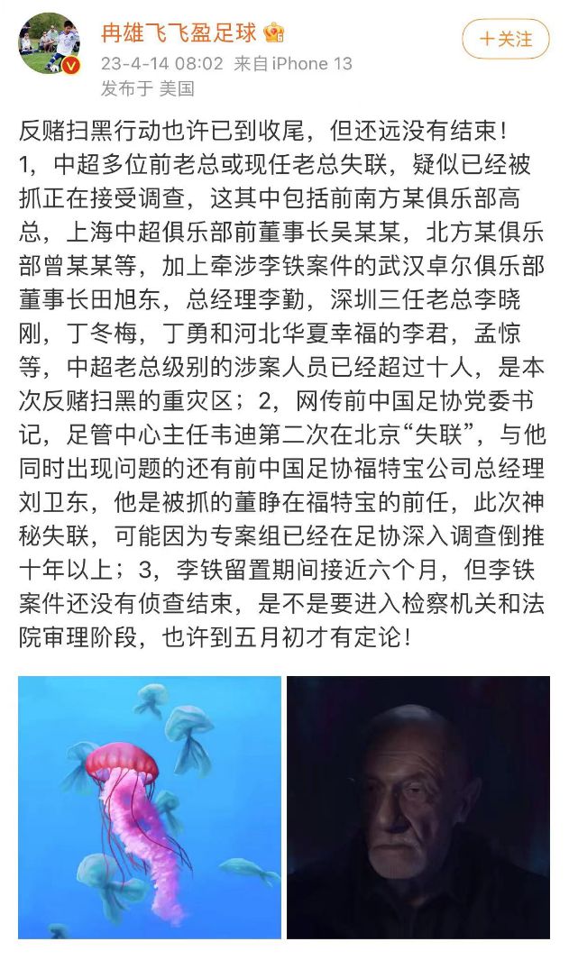 在最近早上八点,冉雄飞在他的社交平台中写下这么一番话。他说中超多位前老总或者现任老总失联疑似被抓,正在接受调查。在说完这番话之后,他在接下来进一步补充点名,到底有哪几个中超的老总已经找不到踪影。这其中就包括前南方某俱乐部高总,上海中超俱乐部前董事长吴某某,北方某俱乐部曾某某总共三个人。