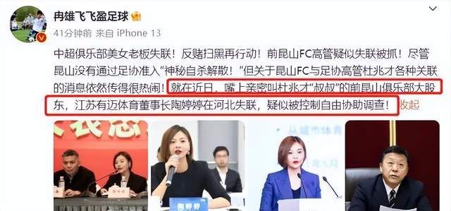 根据著名国内足球媒体人冉雄飞的报道,目前已经超过十名中超的老总,俱乐部总经理或者说是高管纷纷已经是被带走调查,或者是已经失去联系了,这其中他还指出了几家俱乐部,比如说上海某俱乐部,深圳的俱乐部,这些高管都已经进去了。有一个人,他是直接指名道姓的指出了,就是昆山FC也是上赛季中甲的一支升班马,这支俱乐部的美女老总陶婷婷已经是确定落网,而陶婷婷跟杜兆才的关系是极其密切的。