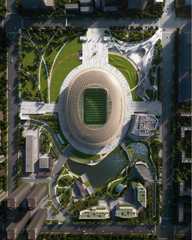 虽新工体在外观上保持了原来的特色,但并非"复原一个工体"。围绕地上主要建筑"足球场",新工体周边建设了10万平方米的城市公园和3万平方米人工水系,以及近20万平方米(一期)的商业广场,成为北京最大的城市公园综合体,带动文体产业链的整体发展。