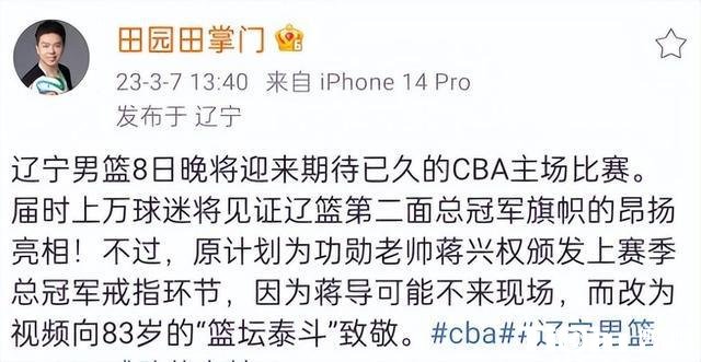 原本辽宁男篮83岁老爷子蒋兴权会出现在现场,而据辽宁媒体最新的爆料蒋兴权由于个人原因无法出席。蒋兴权因为年事已高,而且患上了流感,所以他无法出席后,辽宁男篮管理层为他颁发总冠军戒指,采取播放视频的形式向老爷子致敬。球迷们都希望今天辽篮与上海能够给大家呈现上一场精彩的比赛,但是也希望我是郭艾伦、赵继伟还是蒋兴权都能够身体健康。