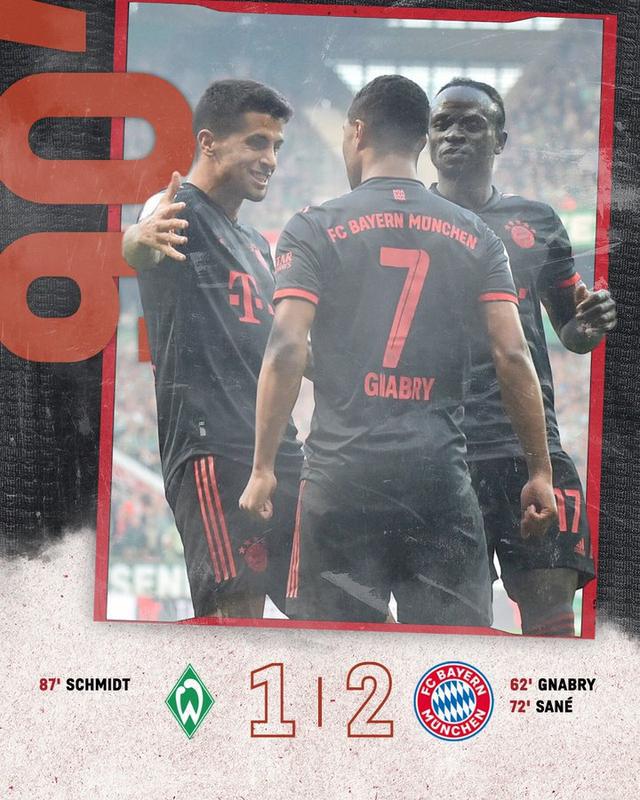 北京时间5月7日凌晨0点30分,2022-23赛季德甲联赛第31轮,领头羊拜仁慕尼黑客场挑战不莱梅。上半场,两队都没有进球;下半场,格纳布里打破僵局,替补出场的萨内再下一城,尼克拉斯-施密特轰出世界波扳回一球。最终,拜仁2-1击败不莱梅,先赛一场在积分榜上以4分优势领跑。