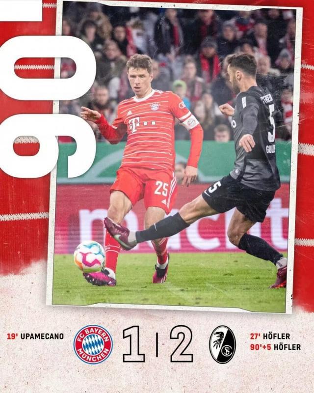直播吧4月5日讯 北京时间4月5日凌晨2点45分,2022-23赛季德国杯1/4决赛在安联竞技场展开角逐,拜仁慕尼黑坐镇主场迎战弗赖堡。上半场于帕梅卡诺先拔头筹,霍夫勒世界波扳平,下半场格雷茨卡中框,穆西亚拉终场前手球送点,霍勒点射绝杀。最终拜仁慕尼黑主场1-2遭弗赖堡逆转淘汰,拜仁止步德国杯8强。