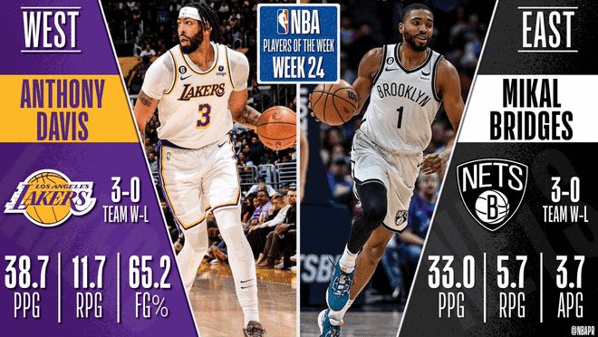 NBA官方宣布,凭借过去一周的出色表现,布鲁克林篮网队的布里奇斯和洛杉矶湖人队的戴维斯被评为东西部第24周的周最佳球员(当地时间3月27日-4月2日)。