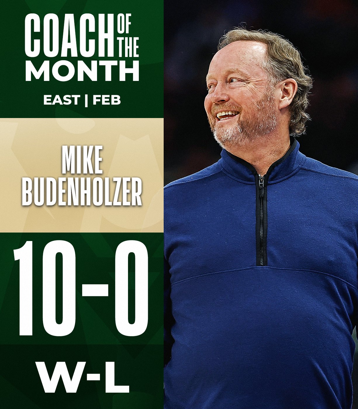 此為布登霍爾澤執教生涯第7次獲月最佳教練,為雄鹿隊主帥第5次。二月份,他率雄鹿拿10勝0負完美戰績,這是隊史第4次單月不敗紀錄,也是第二次10+場次不敗紀錄。