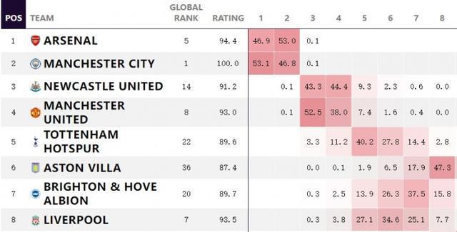 直播吧4月15日讯 数据机构OPTA预测了英超最终排名,卫冕冠军曼城夺冠概率(53.1%)略高于当前的领头羊阿森纳(46.9%)。