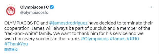 俱乐部与J罗已经决定终止合作。哈梅斯将永远是我们俱乐部的一部分,永远是红白大家庭的一员。我们感谢他的付出,祝愿他在未来一切顺利。
