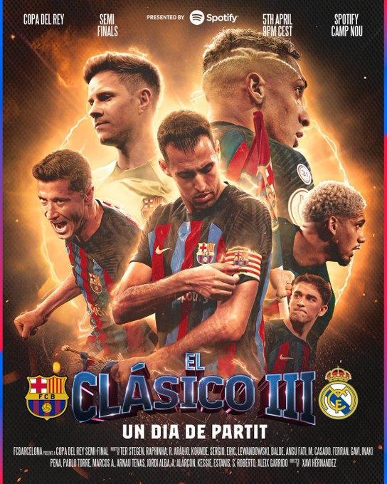 巴萨官方账号在社交媒体上发布了为此役制作的海报,布斯克茨、莱万、特尔施特根、拉菲尼亚等球员出镜。