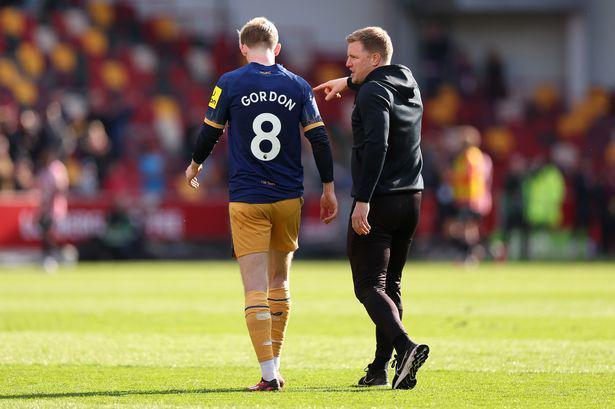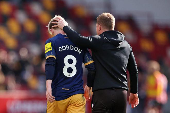 由于已经比分领先,为了能保住胜果,第90+5分钟,纽卡斯尔主帅埃迪-豪换下中场休息时替补登场的前锋戈登,换上中场球员里奇加强防守。但或许是对于自己被换上又换下感到非常不满,戈登走下场时显得十分愤怒,在主帅埃迪-豪向他说话解释时,直接愤怒甩手,随后还始终低头黑脸,不搭理主帅。