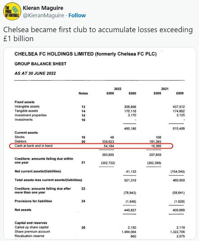 足球金融专家基兰-马奎尔说:“切尔西成为第一家累计亏损超10亿英镑的英超俱乐部。在罗曼-阿布拉莫维奇的领导下,切尔西连续19年每周亏损90万镑。”
