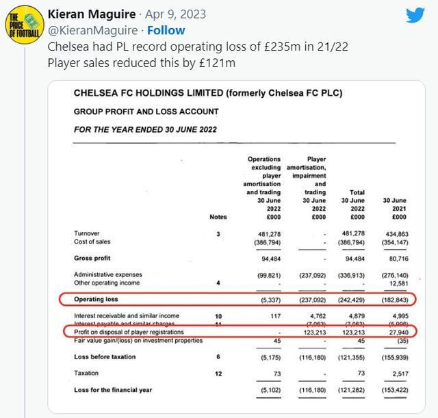 报道称,切尔西的最新账目显示,在截至2022年5月的财政年度里,他们创下了运营亏损2.35亿英镑的英超记录。