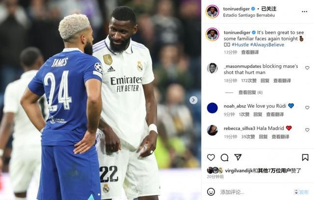 此役吕迪格替补出场对阵老东家切尔西,赛后他在社交媒体上晒出与里斯-詹姆斯的赛场合照,并写道:“很高兴今晚再次见到一些熟悉的面孔。”